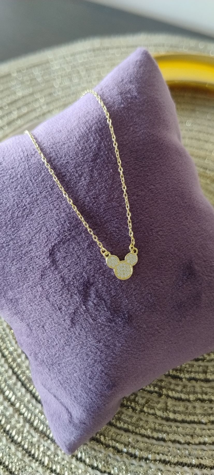 Collar de plata 925 con tono dorado. Modelo con dije cabecita de Mickey incorporado a la cadena y con piedras cubics engarzadas. Diseño delicado con cadena finita de largo 45 cm.